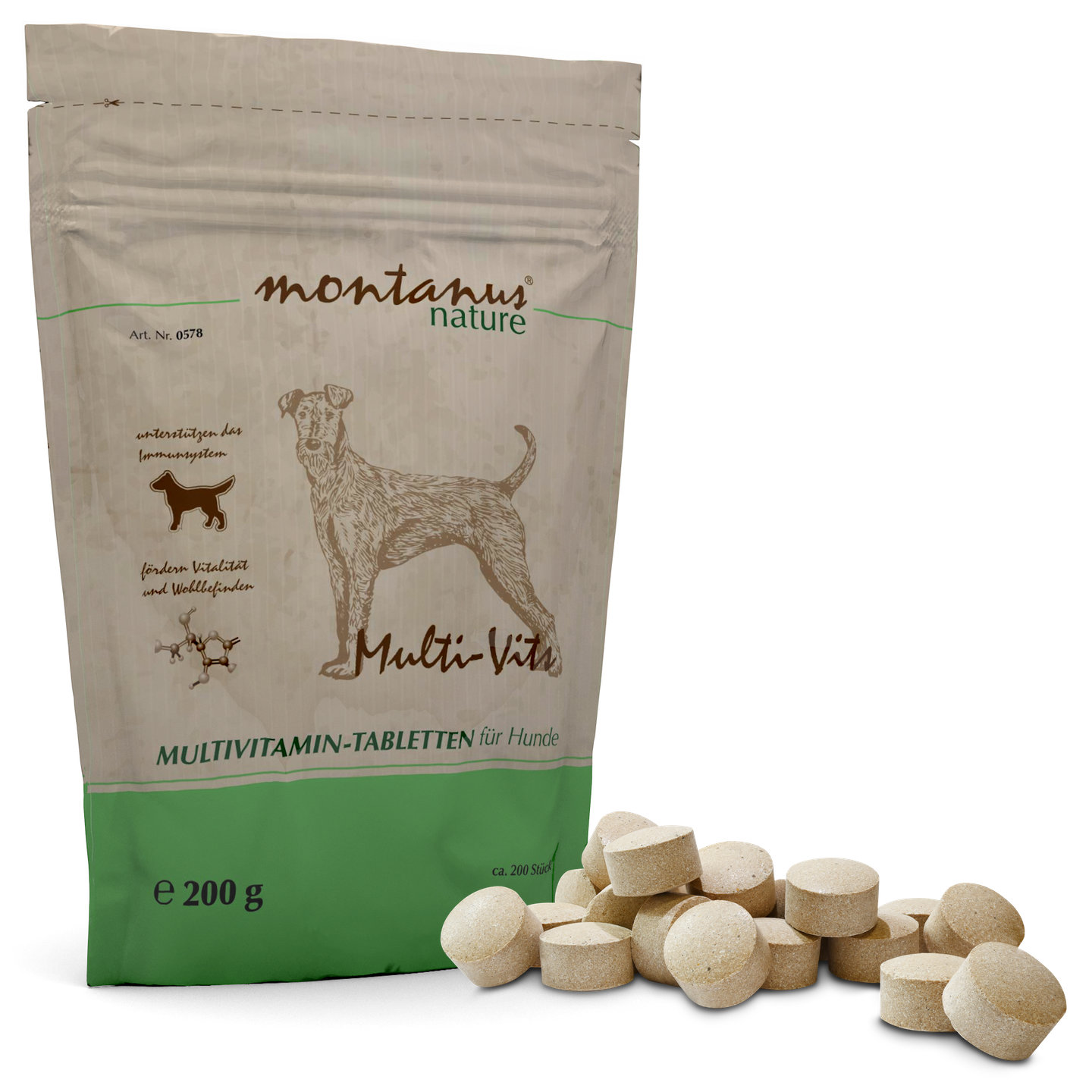 montanus® nature Multi-Vits are multivitamin tablets for dogs. The 13 essential vitamins prevent deficiency symptoms and promote the vitality and well-being of dogs. The vitamins stimulate the metabolism and support the immune system of our four-legged friends.